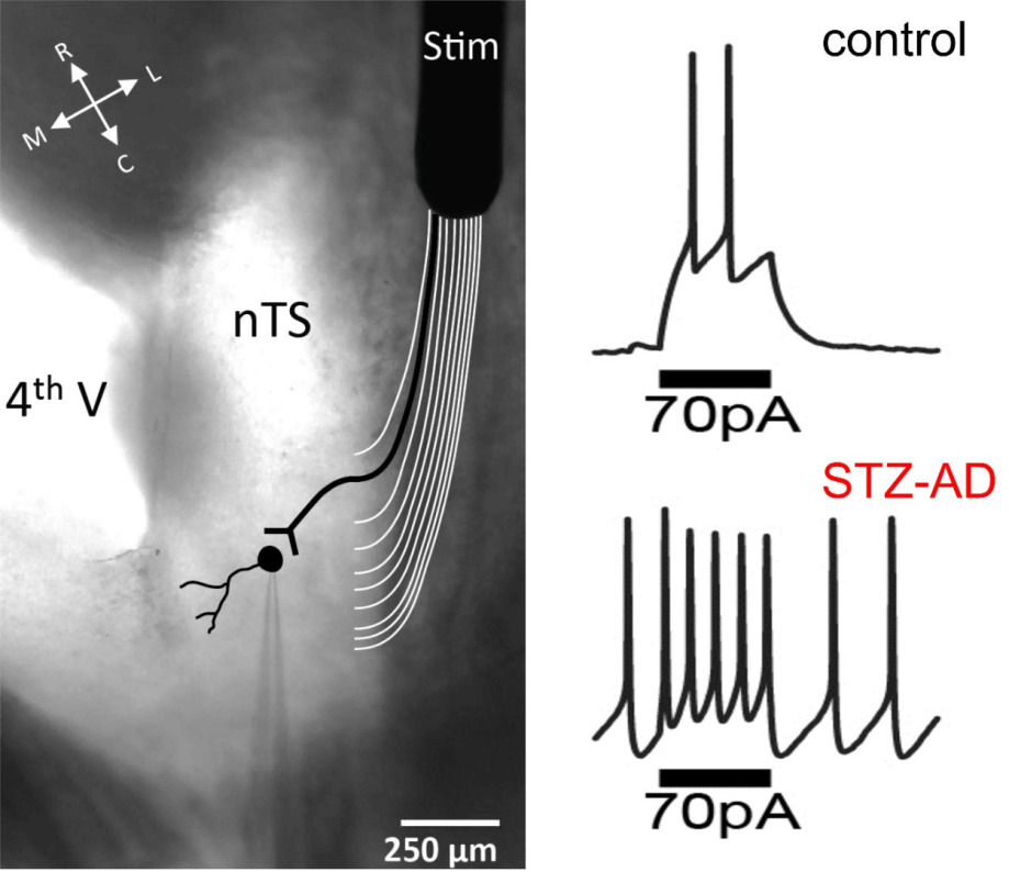 The Ostrowski lab integrates several techniques to unravel the underlying mechanisms of autonomic and respiratory dysfunction in Alzheimer’s disease (AD). We are using a non-transgenic rat model to mimic the sporadic form of AD, which affects about 95% of all patients. Small doses of Streptozotocin injected into the lateral ventricles of the rat brain elicits many pathologies commonly observed in human AD, including memory loss, amyloid plaques, and hyperphosphorylated tau. Other commonly observed signs are increased inflammation, oxidative stress, and neuron loss. In addition, the STZ-rat model of AD displays alterations in cardiorespiratory function. Such disturbances may be due to alterations in brainstem nuclei that are important for the maintenance of blood pressure and respiration.